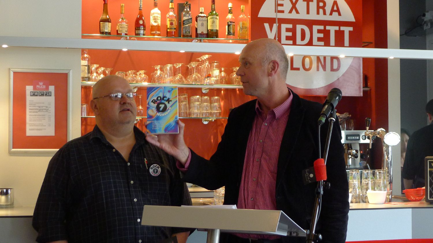 Bill Mensema is niet alleen schrijver, hij heeft ook een roemrucht verleden als rocker. Gisteren werd in de Brasserie van Het Paleis in Groningen zijn bundeling muziekverhalen gepresenteerd. Uitgever Anton Scheepstra van Passage maakte een doos open met een scherp mes en gaf daarna het eerste exemplaar van Rock 7 aan de gelukkige auteur.