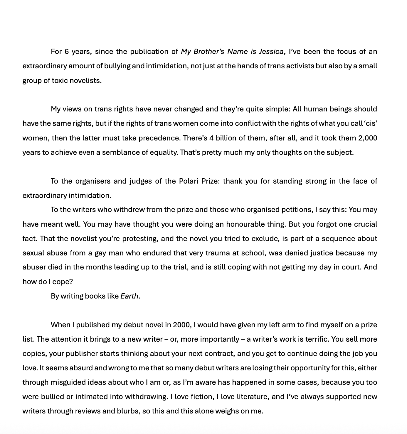 John Boyne stond met zijn boek Earth op de longlist van de Polari Prize, een prijs voor LGBTQ+ literature uit het Verenigd Koninkrijk en Ierland. Dat was tegen het zere been van enkele schrijvers, want Boyne wordt door deze schrijvers gezien als anti-trans. Boyne ligt onder vuur sinds zijn boek My Brother’s Name Is Jessica en zijn steun voor J.K. Rowling die als het ultieme kwaad wordt gezien op dit gebied. Hij noemt zichzelf in een stuk ter ere van haar ook een fellow Terf (trans-exclusionary radical feminist).