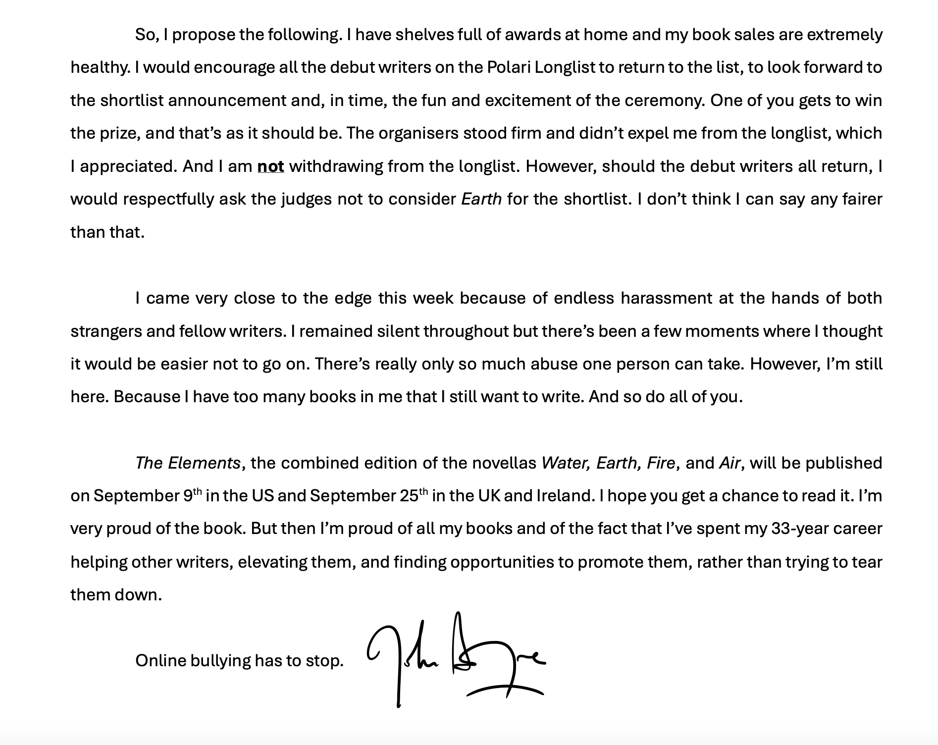 De hatemail en controverse rond Boyne zorgde ervoor dat er bijna aan onderdoor ging, schreef hij in een statement op Twitter. Hij stelt voor dat de schrijvers die hun boeken van de lijst gehaald hebben terugkeren en dat de jury hem niet in aanmerking laat komen voor de shortlist: