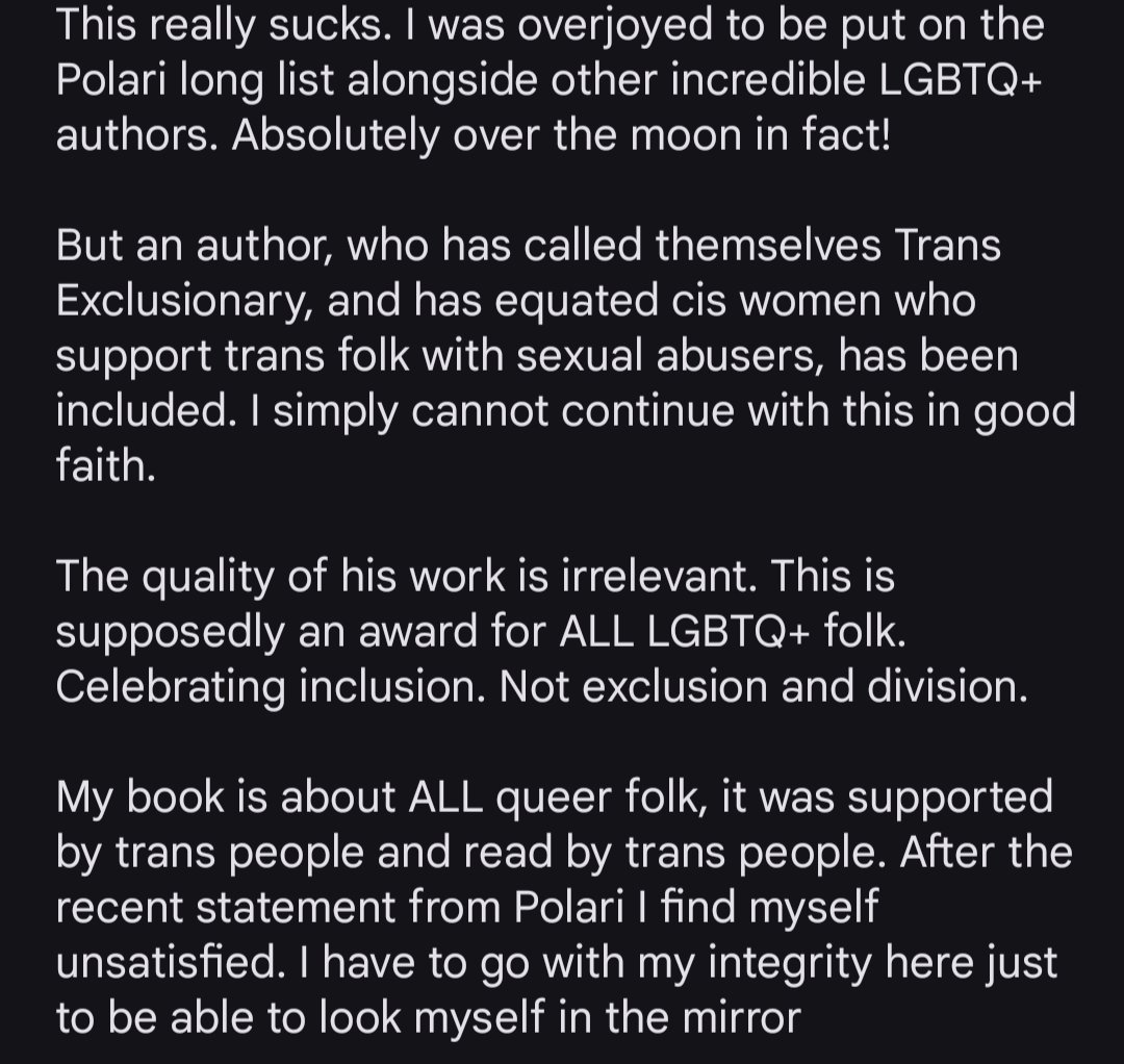 Steeds meer schrijvers, in eerste instantie van de Polari Prize voor debuten, maar later ook schrijvers van de gewone Polari Prize besloten om hun boek terug te trekken voor deze prijs. Schrijver Jay Hulme houdt op Bluesky de stand van zaken bij. Inmiddels hebben 16 van de 24 auteurs zich teruggetrokken, evenals twee juryleden.