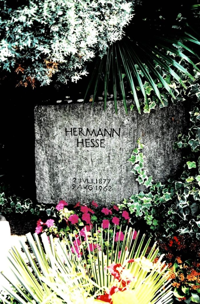 Om de schrijver en zijn vrouw Ninon een laatste groet te brengen dalen wij af naar S. Abbondio. In het middeleeuws decor, waarin een man op een steiger een fresco van een romaans kerkje restaureert, draaien wij linksaf naar het kerkhof. Twee mannen liggen geknield naast een zerk onkruid te wieden. Op mijn vraag waar Hermann Hesse begraven ligt, wijzen zij synchroon naar de hoek achter hen. Geen praalgraf, geen buste, maar een ruw, grauw rotsblok als een toevallig aanwezige steen. De naam van de schrijver plus de datum van geboorte- en sterfjaar (1877-1962). Ernaast ligt als een tegel in het gras de steen van zijn vrouw Ninon Dolbin.