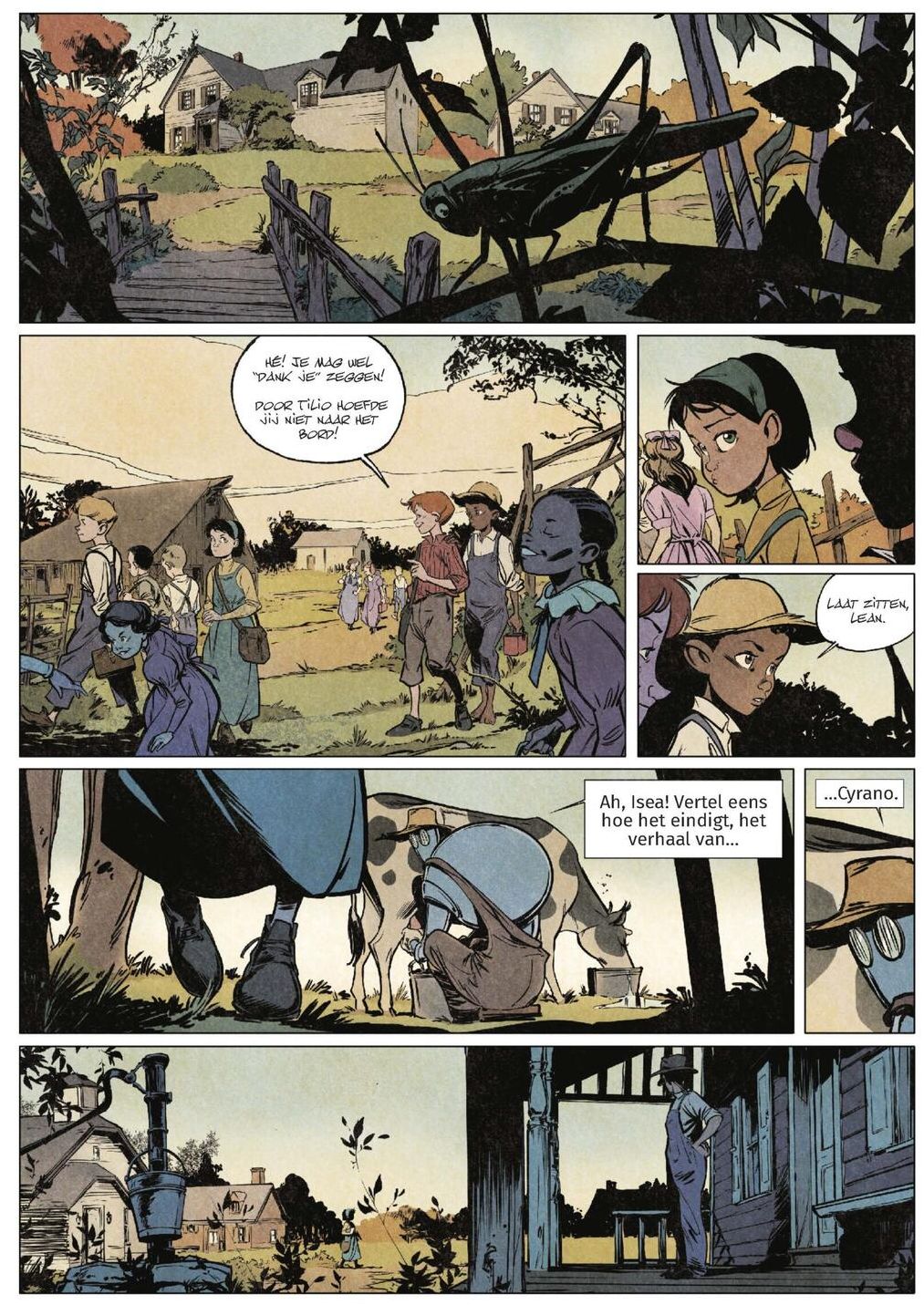 In de plantage-setting ligt het voor de hand te denken dat de robots de plaats hebben ingenomen van de zwarte slaven van toen, maar daar is op een halfslachtige manier omheen gewerkt. Het witte meisje Iséa zit in een gemengde klas, samen met de donkere Tilio die heimelijk verliefd op haar is. Toch is er iets wat hem weerhoudt met haar te praten. Het Franse scenaristenduo dat schuilgaat achter het pseudoniem BeKa (Bertrand Escaich en Caroline Rogue) koppelt dat aan het verhaal van Cyrano de Bergerac, wat het kleurverschil tussen Iséa en Tilio toch op een bijzondere manier accentueert, omdat er behalve zijn huidskleur niets anders is aan Tilio – zijn neusje is zelfs opvallend klein. Misschien slaat de woke-radar hier onterecht aan, maar toch: als de kleuren waren omgedraaid, dan was Cyrano even onlogisch geweest.