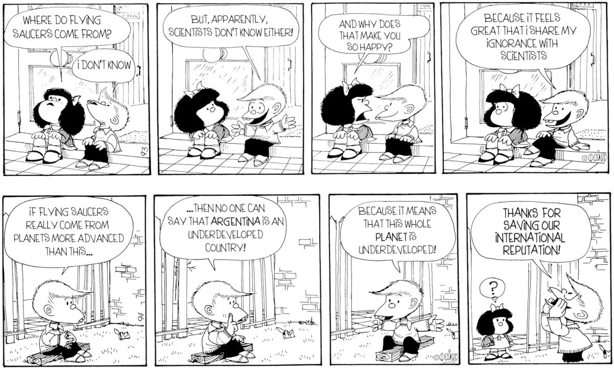 De strip heeft iets weg van Peanuts en van Calvin en Hobbes, in die zin dat Mafalda’s observaties en opmerkingen veel verder gaan dan dagelijkse dingetjes en kinderlijke situaties. Ze is een tikje filosofisch en kritisch op een niet opdringerige manier: ze stipt ongerijmdheden aan, net als Calvin van Bill Watterson, om ze daarna bij de lezer te laten. Knap, want wat de strip ook laat zien is dat het niet van nu is. Mafalda speelt onmiskenbaar in een andere tijd, op een ander continent en onder andere omstandigheden – in 1966 vond er in Argentinië een militaire staatsgreep plaats en de daaropvolgende dictatuur van Juan Carlos Onganía.