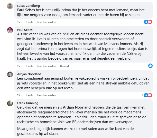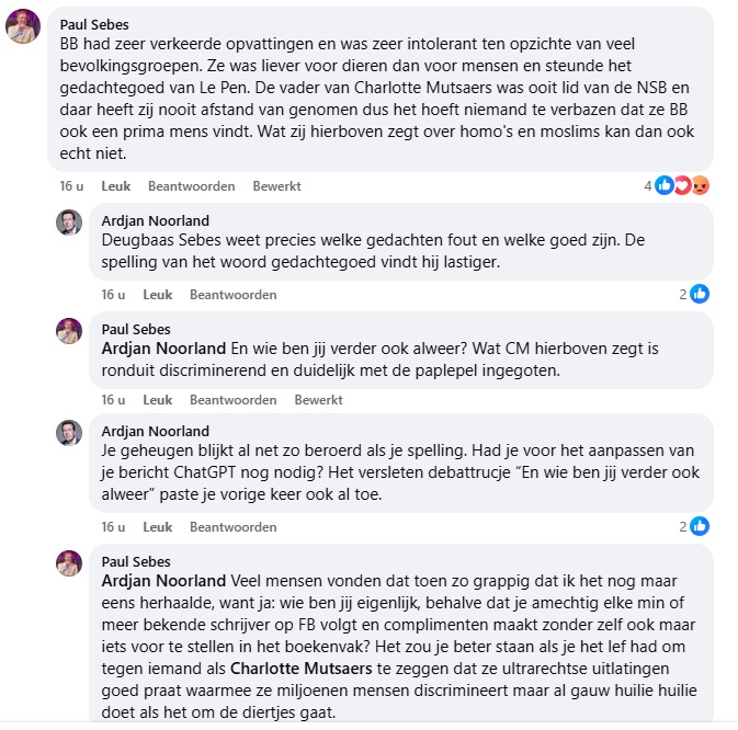 Enkele volgers van Mutsaers wijzen haar ook op de minder fijne kanten van Bardot. Ook literair agent Paul Sebes mengt zich in de discussie die ontstaat: