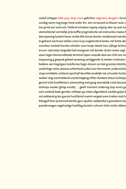 Het hart ligt op de tong, dacht ik even, toen ik de debuutbundel bleke gesp, beige zoom van Roelof Schipper in mijn hand had. Het is namelijk of je de gehele tekst uit het hart van de bundel ook buiten op het omslag vindt, alle woorden achter elkaar geplakt. Prachtig vormgegeven! Als je binnen en buiten daadwerkelijk met elkaar gaat vergelijken, merk je dat hier en daar wat woordjes ontbreken, waardoor je op zoek gaat, omdat je denkt dat je iets over het hoofd hebt gezien. Wat er ontbreekt, raak je steeds meer kwijt, waardoor je houvast verliest, terwijl je juist dacht dat je een spoor had gevonden. Met de bundel voel je je net een strandjutter. Je hebt een schat gevonden, die hier, onmiskenbaar, voor je voeten is aangespoeld, maar je mist context, terwijl je vermoedt dat juist dat missen – paradoxaal genoeg – essentieel is in deze vondst.