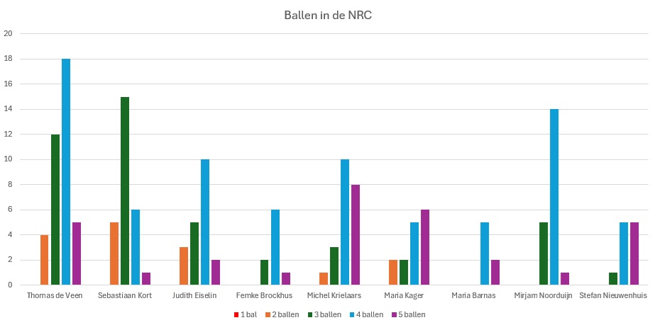 Een paar jaar geleden hielden we de ballen bij van de NRC-recensenten. Onlangs merkte iemand in mijn omgeving op dat de recensies met 1 bal volledig verdwenen waren. Hieronder een steekproef bij enkele recensenten van de NRC (in de hoop dat ik alles goed geteld heb) in de categorie van fictie, non-fictie, poëzie en strips.