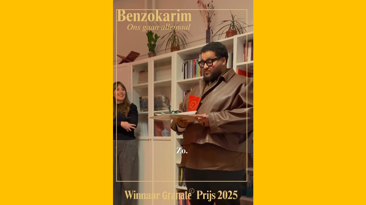 Benzokarim heeft vorige week vrijdag de Granate Prijs 2025 gewonnen met zijn dichtbundel Ons gaan allemaal. Volgens de jury, bestaande uit Yanaika Zomer, Baban Kirkuki en Christine Otten, heeft Benzokarim de meest betekenisvolle titel bedacht – nog betekenisvoller dan Troostpogingen (Twan Vet), Verzachtende omstandigheden (Lotte Dodion), Want straks komen de wolven (Liesbeth D’Hoker) en Zeebeving (Roberta Petzoldt).