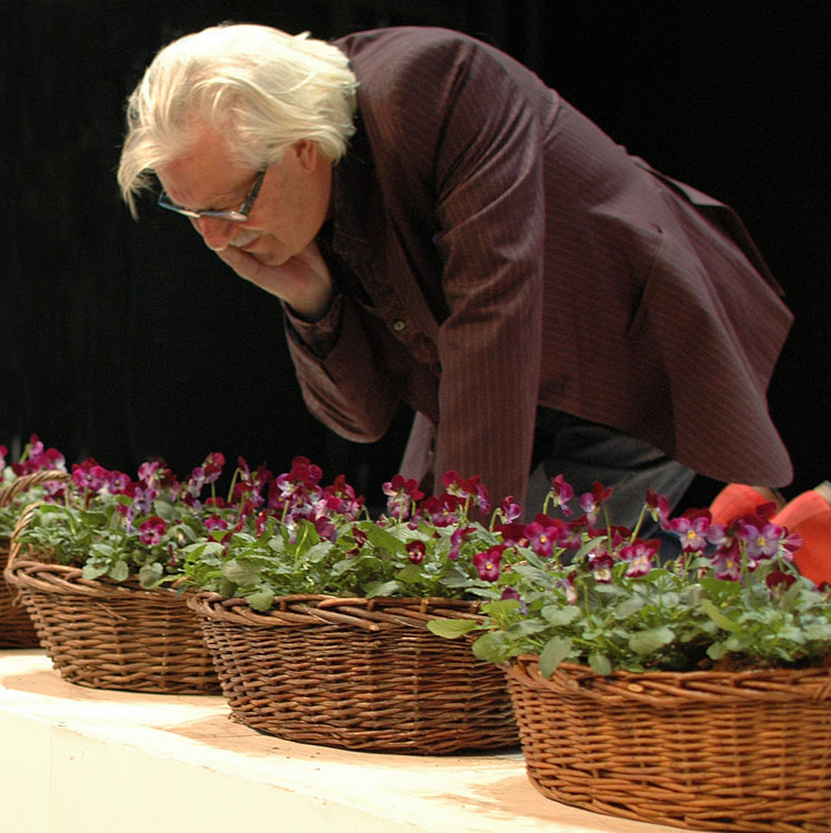 (foto Jan Siebelink knielend voor een bed violen © Dolf Verlinden)