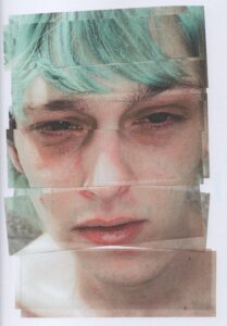 Behalve die analoge foto’s laat De Vries nog wel wat overeenkomsten zien met Amsterdam!. Sommige zwartwit straatbeelden en een aantal onscherpe portretten bijvoorbeeld. Maar toch is De Vries onmiskenbaar een kind van een andere tijd. Zo is daar in de eerste plaats zijn suggestie aan de lezer om zijn boek vooral als een werk- en doeboek te beschouwen. Het is ‘een boek waarin de lezer wordt uitgedaagd de schoonheid van het imperfecte te zien door het zelf te maken. In dit boek kun je scheuren, tekenen, kleuren, plakken.’ De lezer mag het boek dus ‘personaliseren’, zoals Gen-Z’ers dat beter dan welke voorgaande generatie ook, gewend zijn te doen. De inhoud nodigt daar ook toe uit, zoals bij de kleurenfoto van een slapende vrouw die op de naastliggende pagina als kleurplaat is afgedrukt. Of het portret van een jonge man, dat als goed voorbeeld al in repen geknipt lijkt. Andere foto’s zijn voorzien van aanvullingen met kleurpotlood. Maar juist dit soort presentaties kenmerken het nieuwe elan van een jonge generatie die niet per se onder de indruk is van kunst zoals de kunstenaar die aan den volke presenteert.