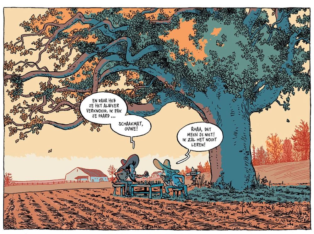 De tekeningen van Jérôme Jouvray zijn gedienstig, met een fijne constante vierstrokenindeling en weinig gedoe op de achtergrond. Hij zou een goede kandidaat zijn om een Lucky Luke door…-album te maken. Hij heeft de slapstick en vooral de menselijke frustratie goed in de vingers: het ongeleide fanatisme van Medoro, de destructieve modus van Medoro’s vader (‘in hun reet!’) en het constante katerige van Lincoln zijn heerlijk uitgebeeld. De monotone uitdrukking van Lincolns kop wordt soms wat eentonig, maar ja, dat zal hem worst wezen.