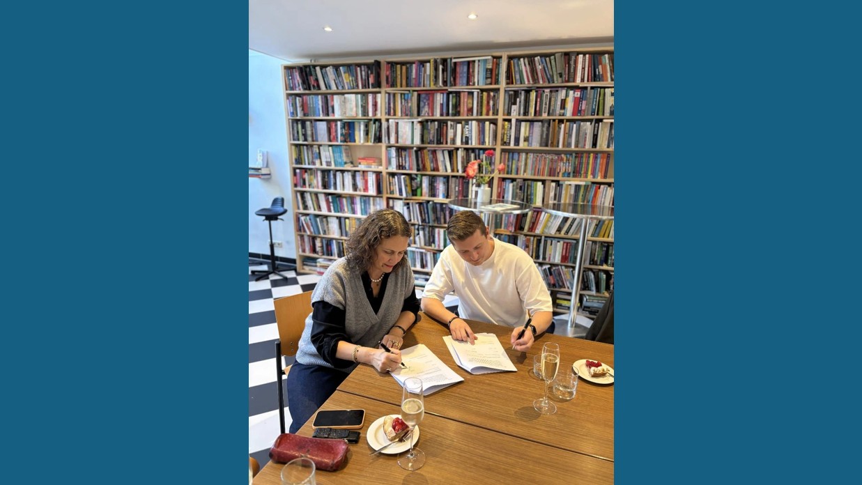 (Afbeelding: Milio van de Kamp en uitgever Elik Lettinga, via Van de Kamps LinkedIn)