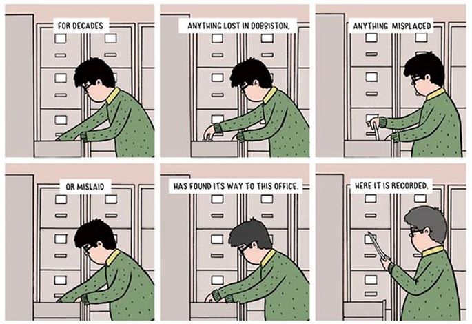 De rust van de tekeningen van Dooley doet iets met de lezer. Het voelt eenzaam aan, waardoor we ons aan de figuren vastklampen. Meneer Daniels en Toby zijn twee buitenbeentjes en hun ideeën en plannen mogen best eens slagen. We gunnen het ze, net als de overige mensen die in Dobbiston wonen. En daarbij is het charmant dat er twee generaties tussen de mannen zitten: meneer Daniels is achter in de vijftig, Toby een zestienjarige knul. Nog interessanter is het universum waarin Dooley het verhaal situeert. Dat lijkt een decor van hout en karton, een plek die niet echt hoeft te bestaan, maar vanwege het verhaal zo is opgetuigd. Datzelfde gevoel heeft de lezer ook in Dooley’s Flake. Er staat geen huis te veel, er zijn uitgestrekte velden omdat dat goed uitkomt, en het gemeentehuis is zo onwerkelijk groot dat Dooley zich halverwege genoodzaakt voelt om uit te leggen hoe dat zo is gekomen.