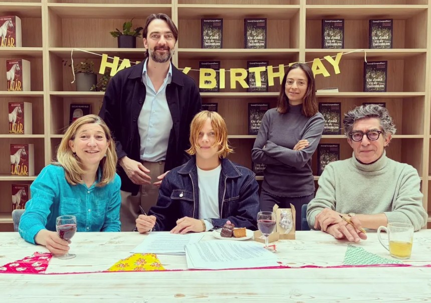(Afbeelding via Instagram Atlas Contact. V.l.n.r.: Directeur-uitgever Tanja Hendriks, manager Michaël Roumen, Lucas Rijneveld, redacteur Marijn Hogenkamp en uitgever Sander Blom)