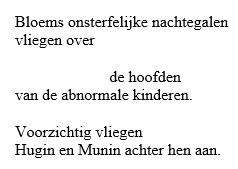 In Bloems gedicht gaat het om het niet te achterhalen geluk. De ik heeft niets van het leven verwacht. In een ander bekend gedicht zegt Bloem dat alles veel is voor wie niet veel verwacht. Onze samenleving verwacht heel erg veel van kinderen. Moeten scholen er niet altijd alles aan doen om het ‘maximale’ uit hen te halen? Doen zij dat niet, dan worden ze door de inspectie op de vingers getikt. Het beeld van de onsterfelijke nachtegalen die over de hoofden van abnormale kinderen vliegen, is fragiel en wonderschoon, niet alleen vanwege het beeld van onsterfelijke vogels die bekend staan om hun prachtige zang, maar ook omdat zij door de verwijzing naar Bloems gedicht over geluk gaan. Geluk trekt zich niets aan van normaal of abnormaal. Hugin en Munin zijn de raven uit de Noorse mythologie, die staan voor het geheugen en de gedachten. Misschien kunnen abnormale kinderen iets minder onthouden dan normale kinderen, maar het geluk vliegt vooralsnog voorop. Hugin en Munin hebben het nakijken.
