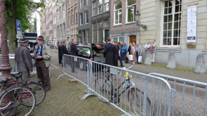 Het is een uur of half zeven als de kist in de vorm van een pennendoos van Gerrit Komrij Felix Meritis weer wordt uitgedragen. Fietsers en wandelaars op de Keizergracht