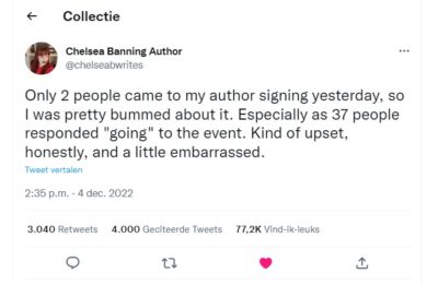 De Amerikaanse schrijfster Chelsea Banning debuteerde in augustus met Of Crowns and Legends. Bij een signeersessie op 3 december kwamen slechts 2 mensen opdagen terwijl 37 mensen online hadden aangegeven