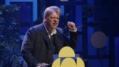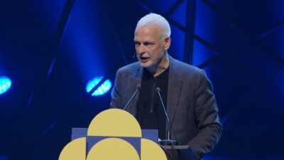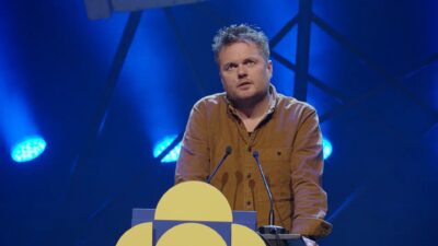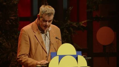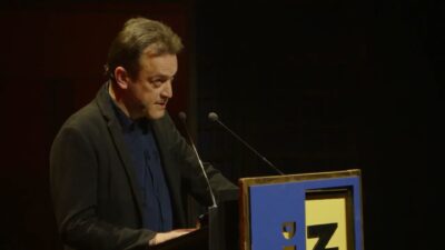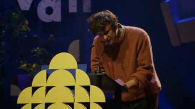 Gebogen over de katheder droeg Bob Vanden Broeck voor uit zijn bundel de richting is richting omleiding, die hem de Poëziedebuutprijs 2024 en de Debutantenprijs 2025 opleverde.